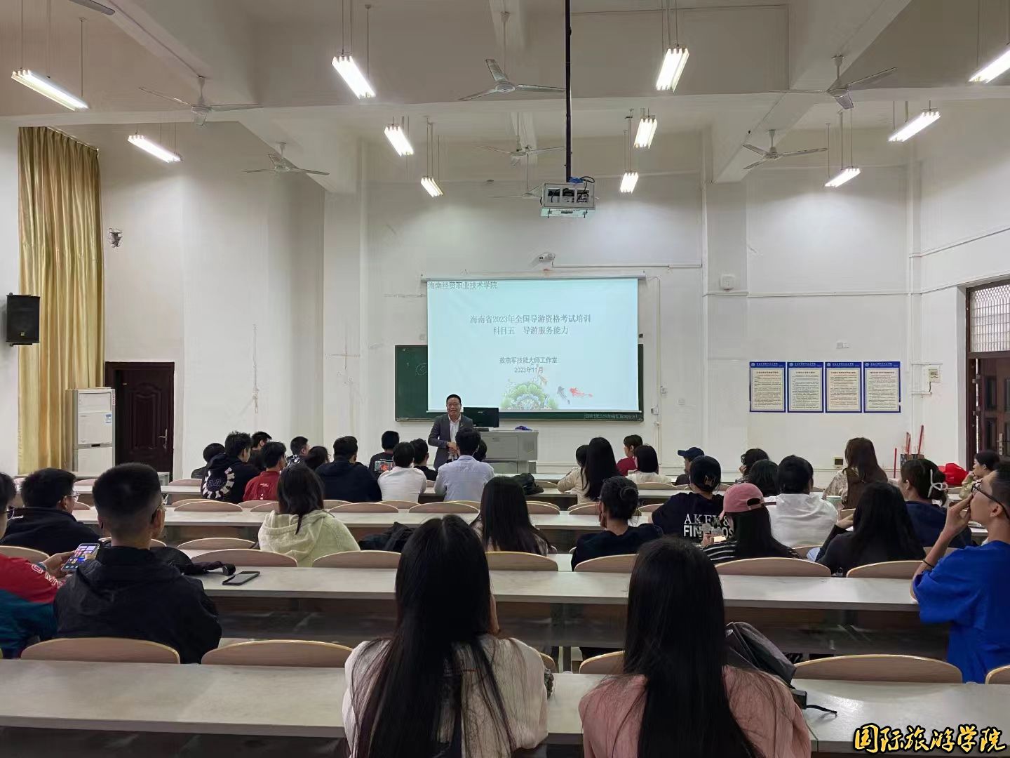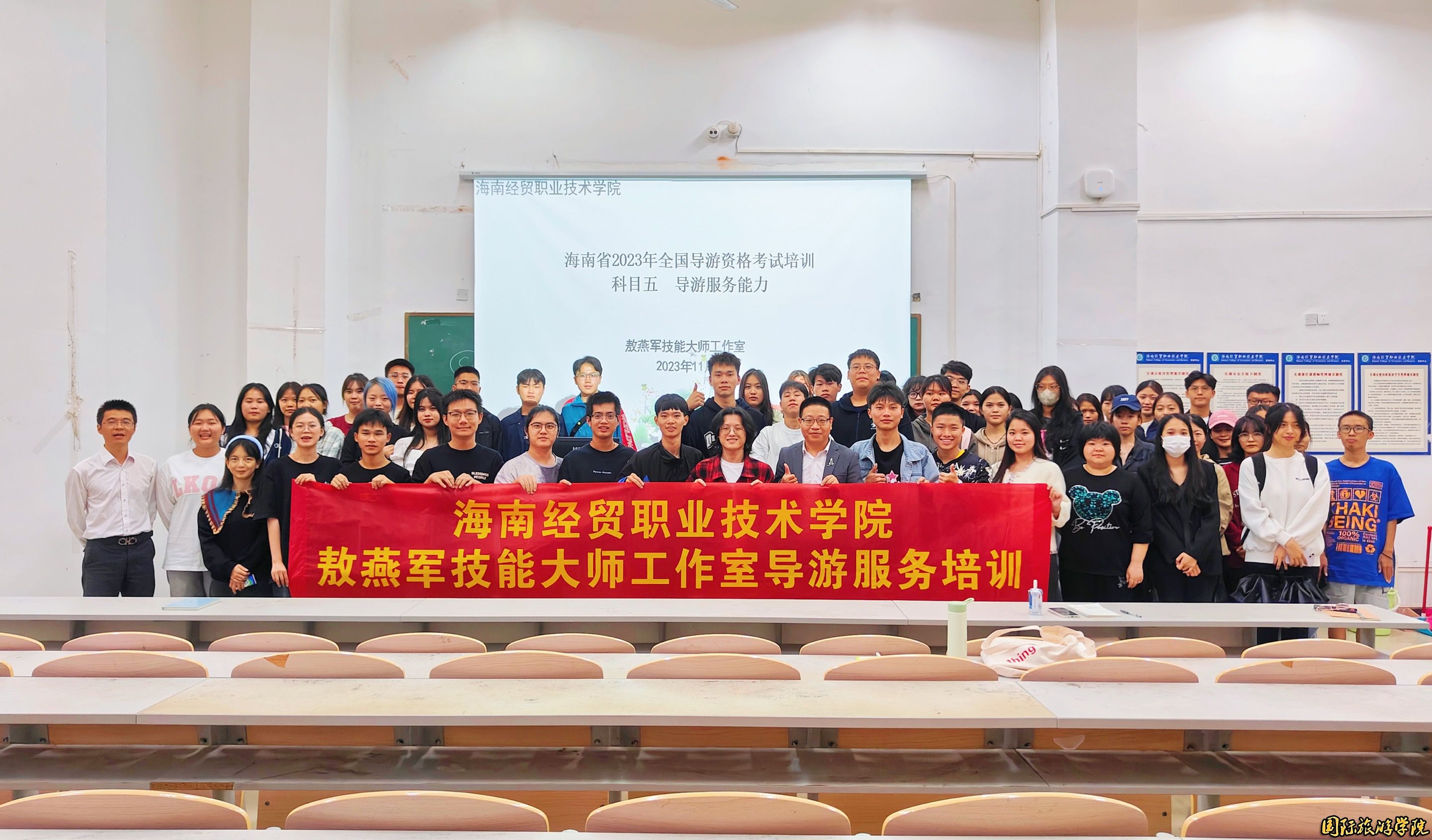 为了帮助同学们备战首届校园导游风采大赛及顺利通过导游资格证考试,公司敖燕军技能大师工作室主持人敖燕军老师,分两批次为在校同学开展专业讲座培训指导。