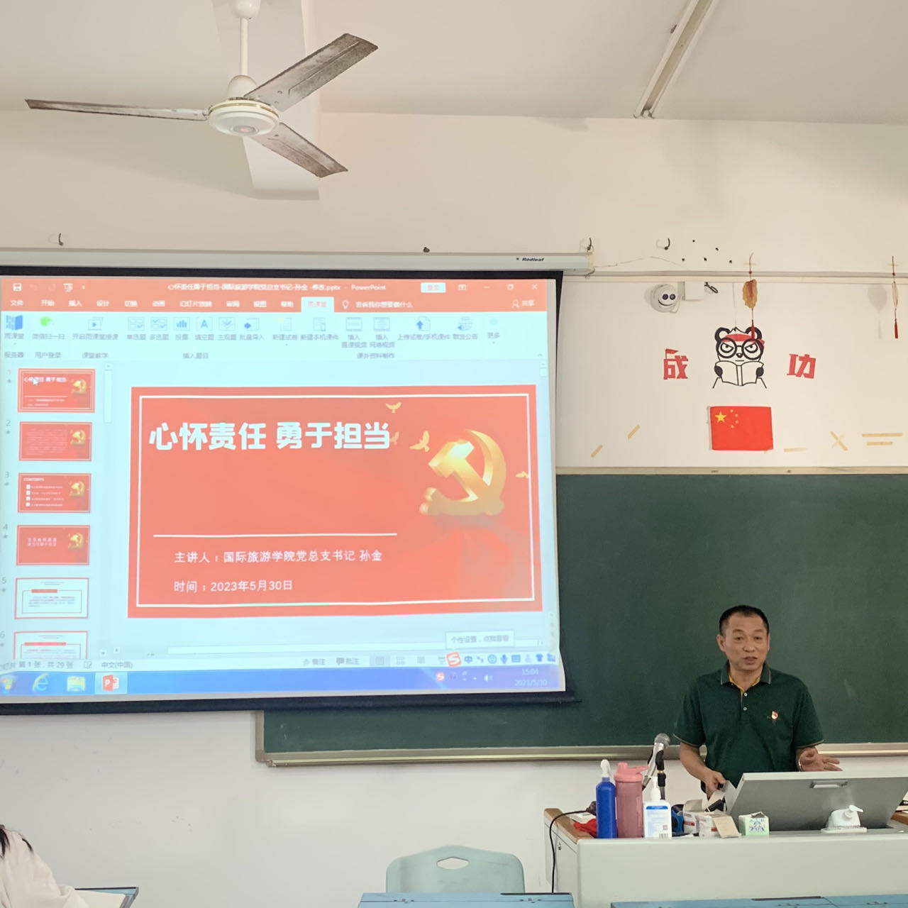 2023年5月30日,国际旅游公司党总支书记孙金为全体教工党员讲授“心怀责任 勇于担当”主题教育专题党课。