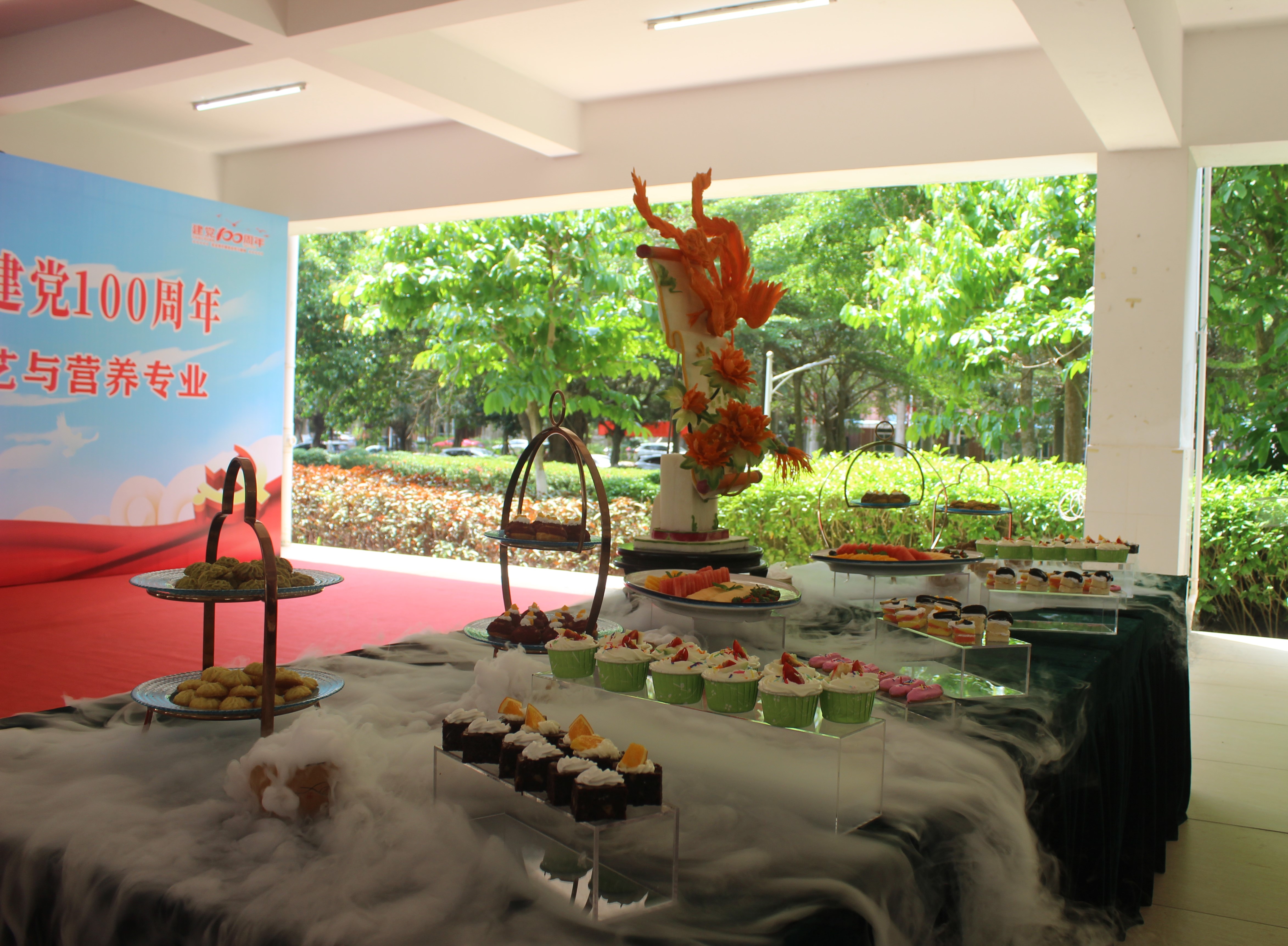 活动现场由旅游管理公司团总支及食品艺术学协会组织筹备。柴国鹏等九位烹饪工艺与营养专业的同学,精心制作名为《绿水青山紫气鸾》食品雕刻作品,寓意着党的事业向阳昌盛,党的历史灿烂辉煌。同时,他们还为现场的师生带来了一份24寸党徽蛋糕以及红丝绒泡芙,闪电泡芙、纸杯戚风,布朗尼蛋糕,双色蛋糕卷,抹茶慕斯,芒果布丁,紫薯麻薯等百余个小蛋糕献礼建党100周年。