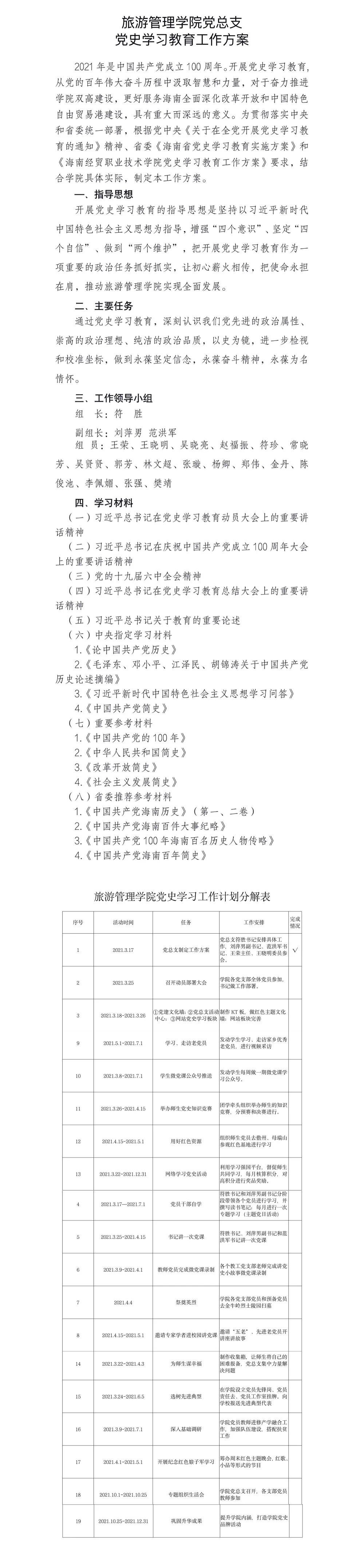 根据公司党委关于《海南经贸职业技术公司党史学习教育工作方案》的文件要求,紧密结合本公司实际情况,旅游管理公司党总支自3月起开展了一系列党史教育系列活动。