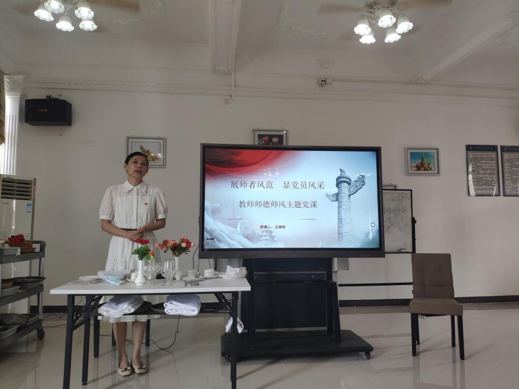 会后,教师党支部书记王晓明以“展师者风范 显党员风采落实”为题,为与会人员讲授学习贯彻习近平新时代中国特色社会主义思想主题教育专题党课。