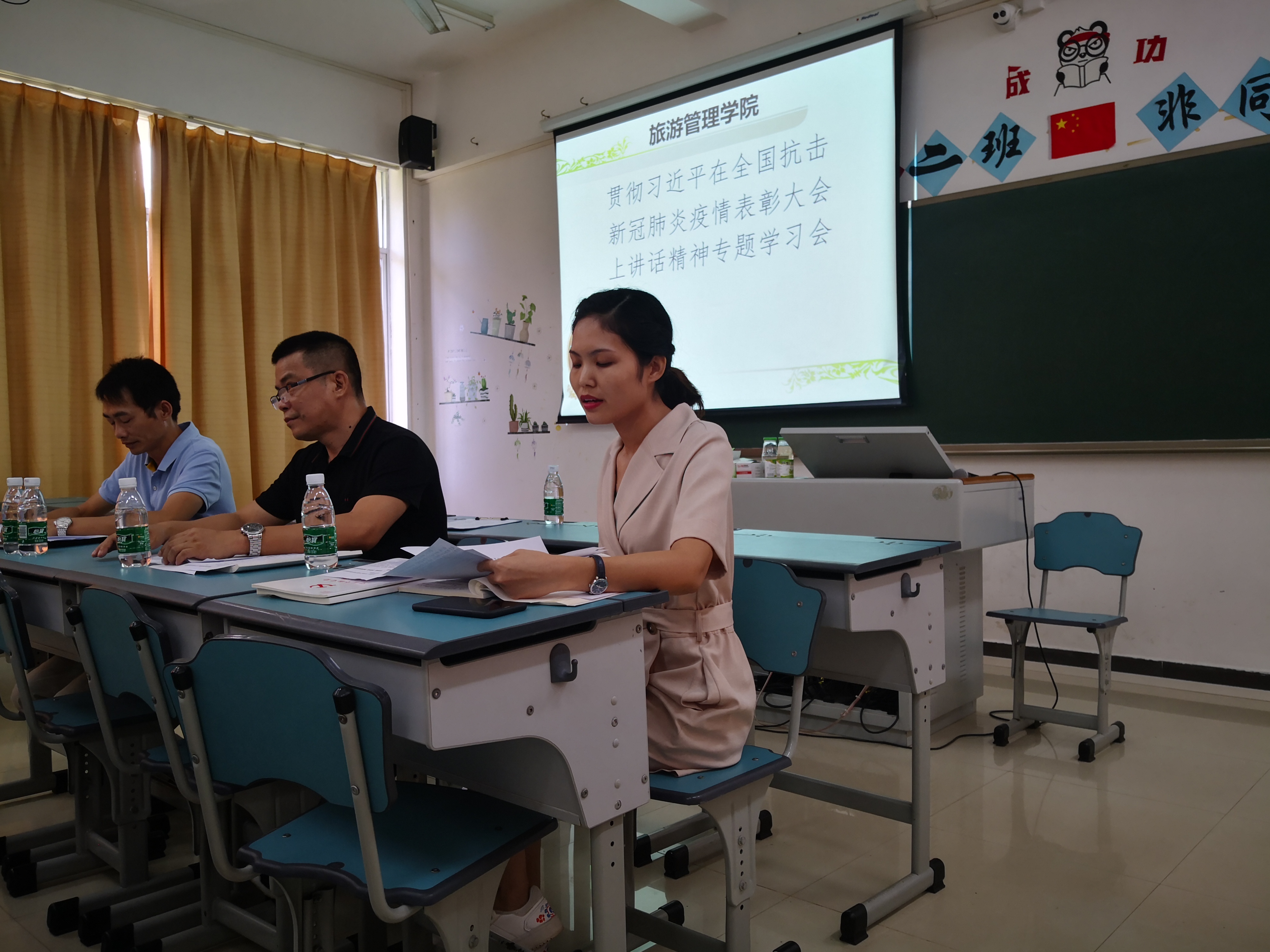 9月15日下午,旅游管理公司党总支在2-208召开会议,专题学习习近平总书记在全国抗击新冠肺炎疫情表彰大会上的重要讲话精神。14名教职工党员参加会议,会议由党总支书记符胜主持。