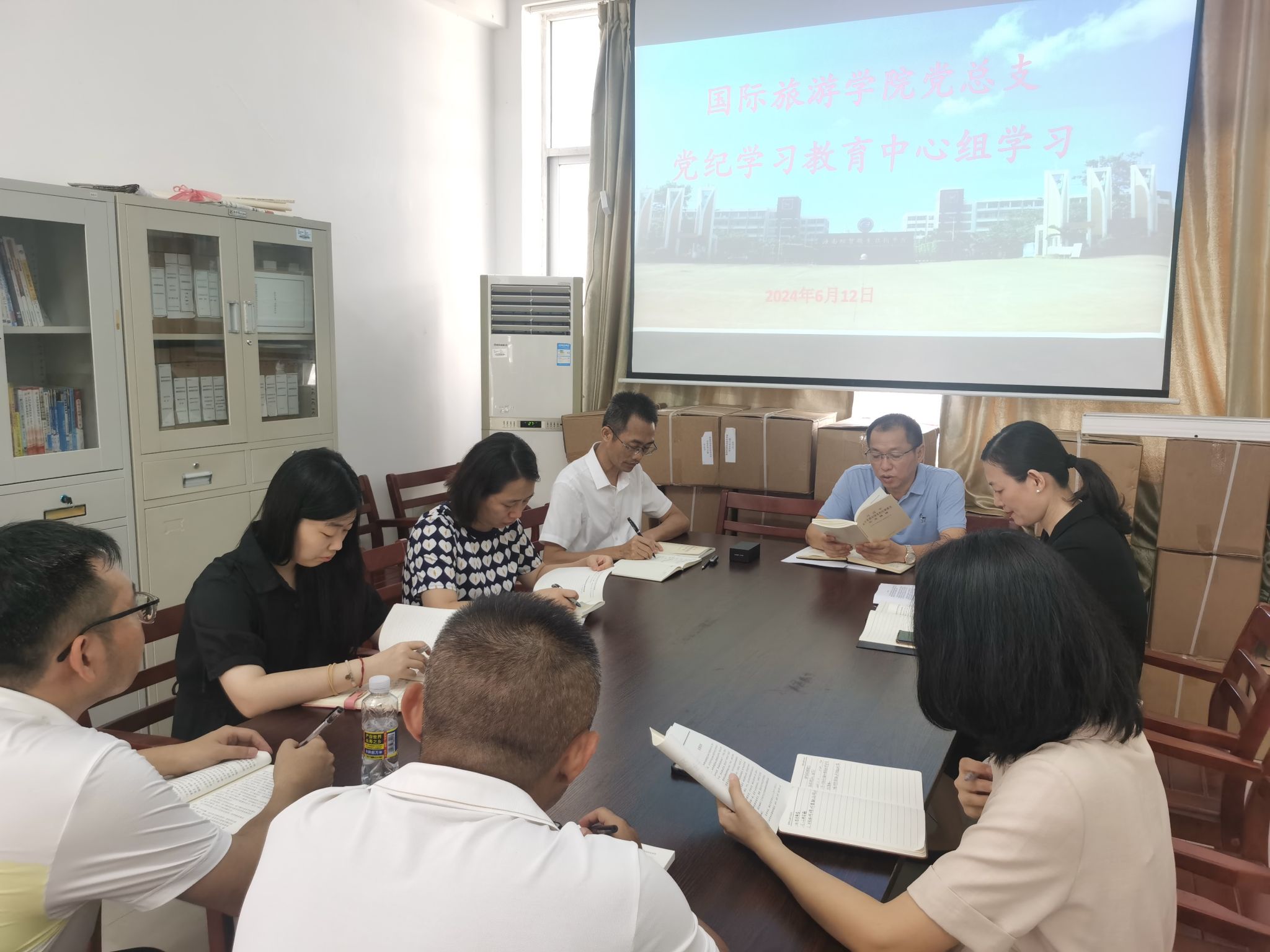 2024年6月12日上午,国际旅游公司党总支在2-210会议室召开党纪学习教育中心组学习会。公司党总支委员和员工党支部教师党员参加会议。会议由党总支书记孙金主持。