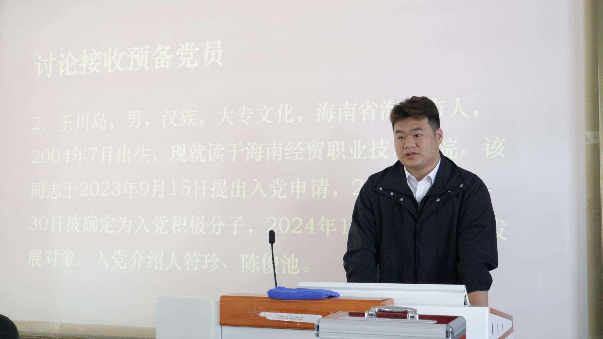 随后,积极分子王川岛、麦惠玺依次就自身在考察期内的生活、工作、思想及学习情况进行汇报。他们既肯定了自己近期在各方面所取得的进步,又坦诚地指出了自身存在的不足之处,与此同时,还表明了自己加入党组织的坚定信念与决心,明确了今后努力方向。