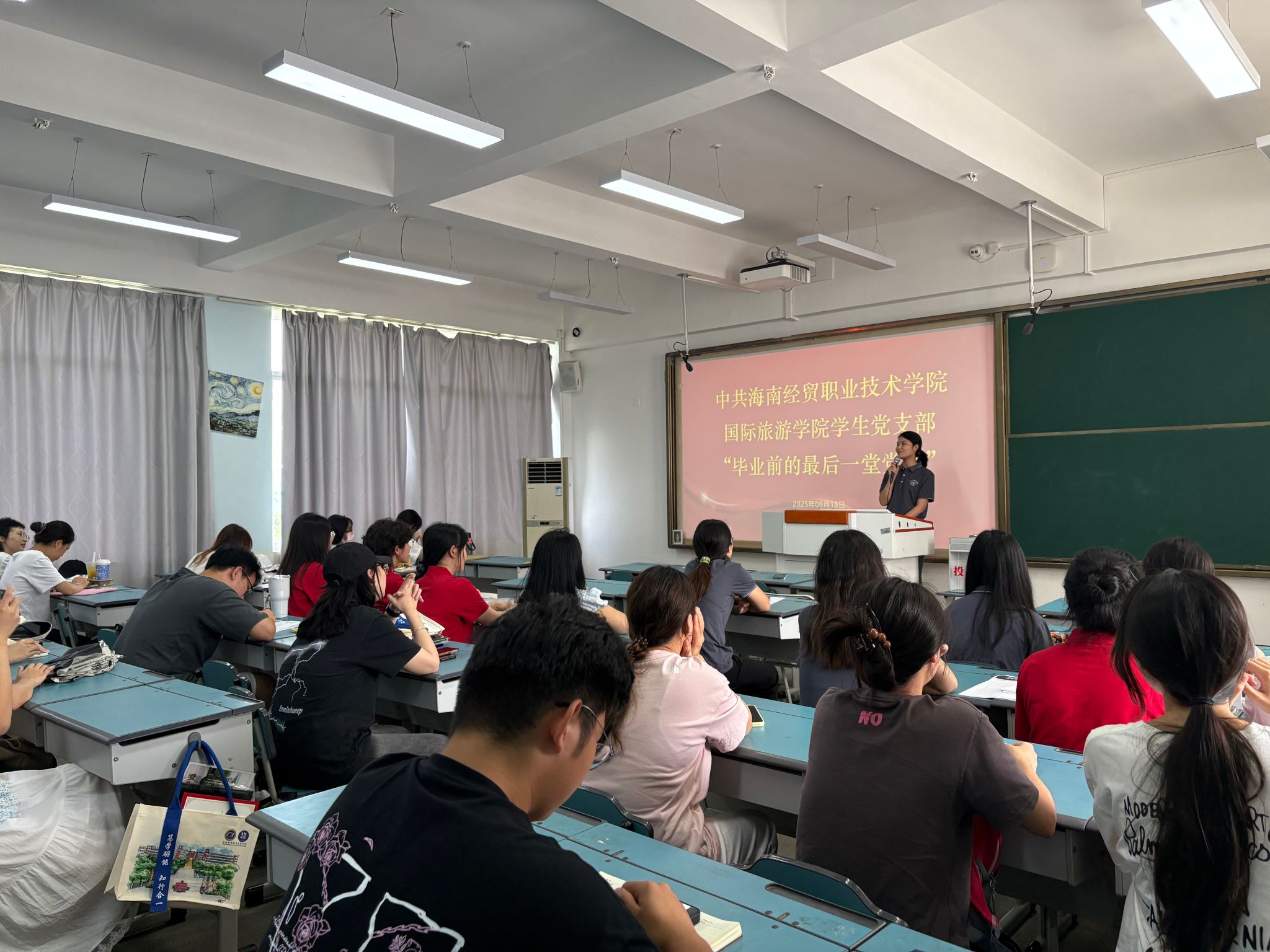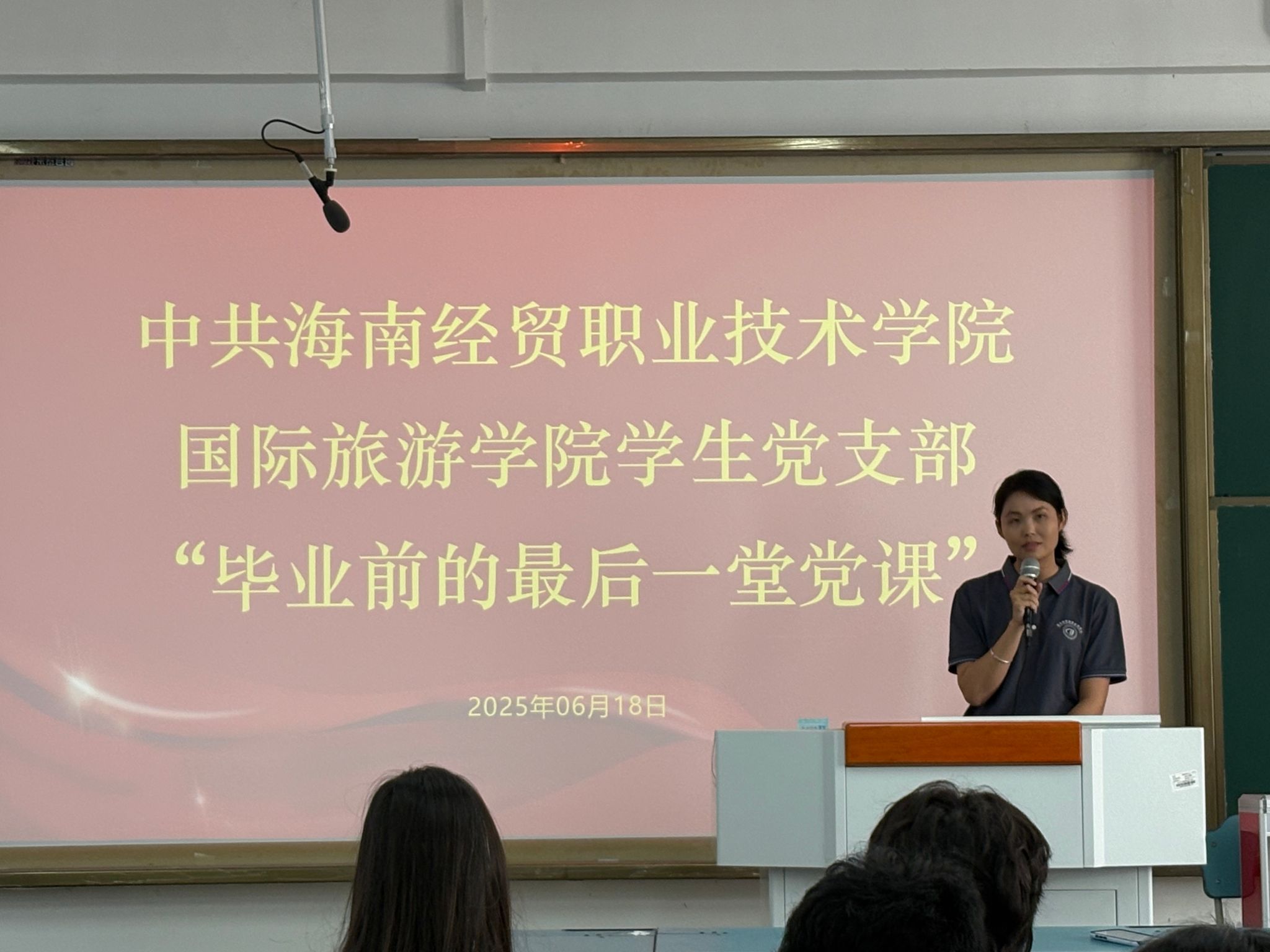 2025年6月18日上午,国际旅游公司党总支副书记刘萍男以“红色水果中的党史智慧:员工党员的奋进指引”为题,在2教506为2025届毕业生党员讲授“最后一堂党课”,开展毕业生党员党性和党纪教育。