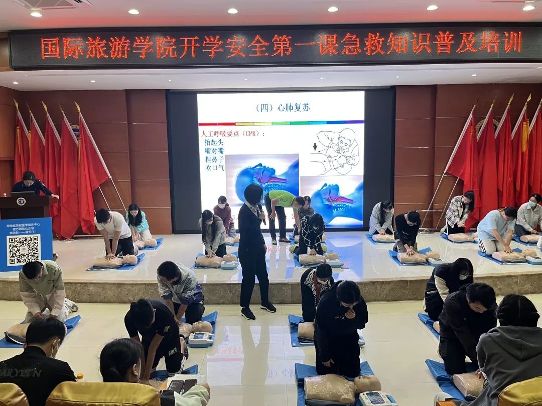 "谁来演练一下心肺复苏术"。同学们自告奋勇上前,"手掌按压在胸骨下段,掌心别翘起....."同学们依照讲师的指点进行按压,姿势有模有样,赢得全场掌声。
