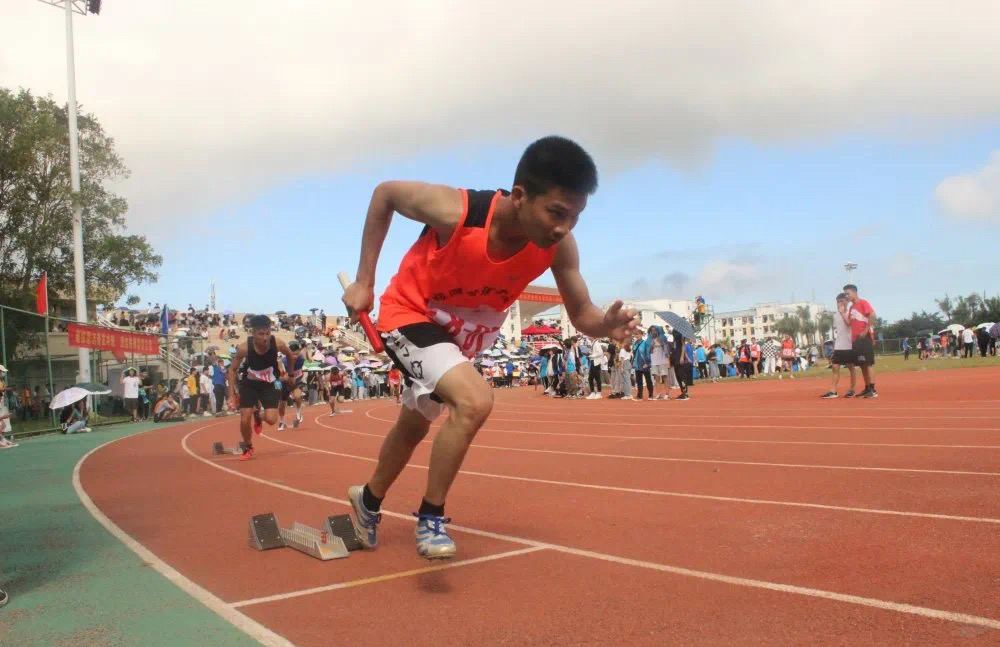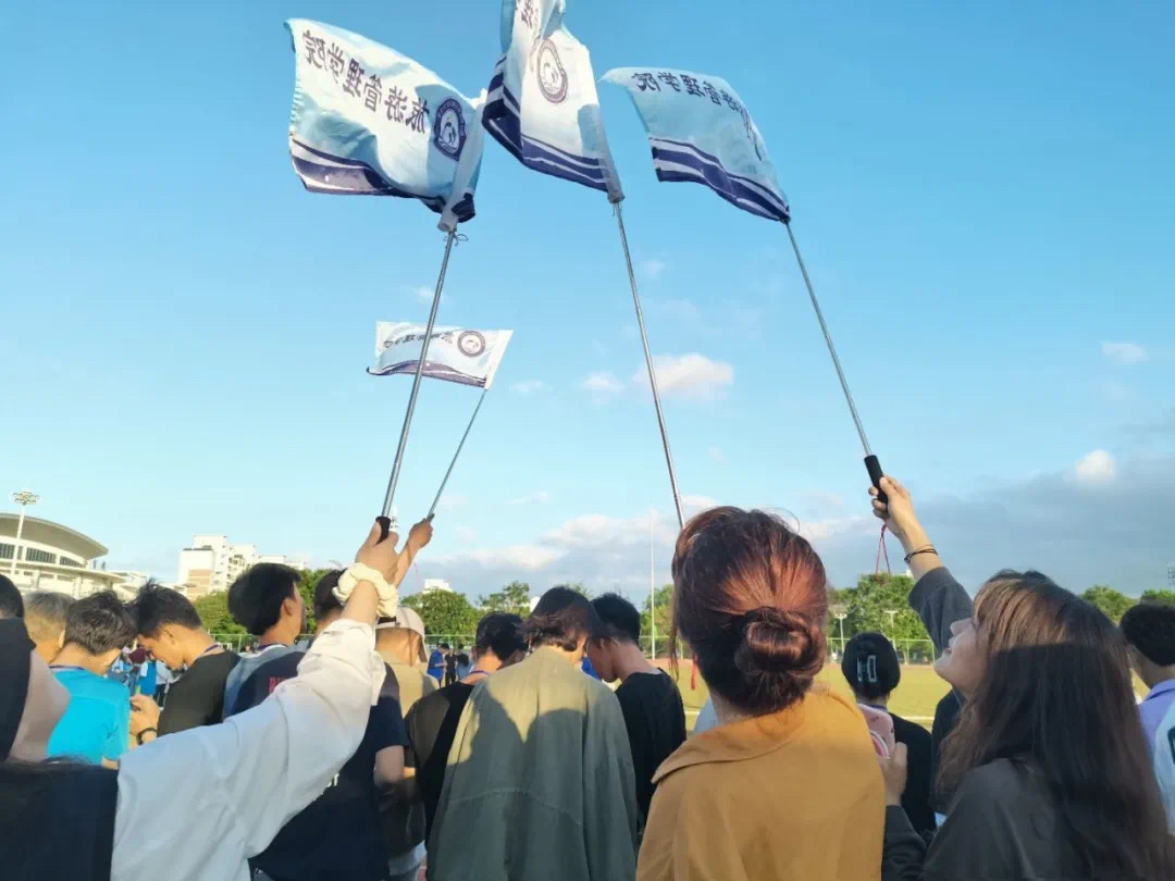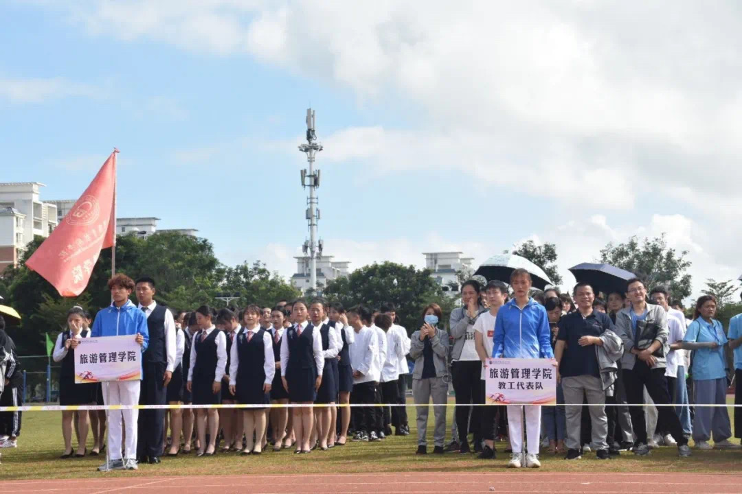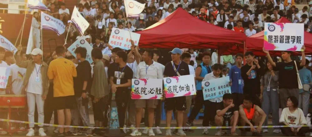 听!跑道两边是旅院师生的呐喊。看!跑道旁一面面蓝色的旗帜,是旅院同学们在为运动员们摇旗助威。