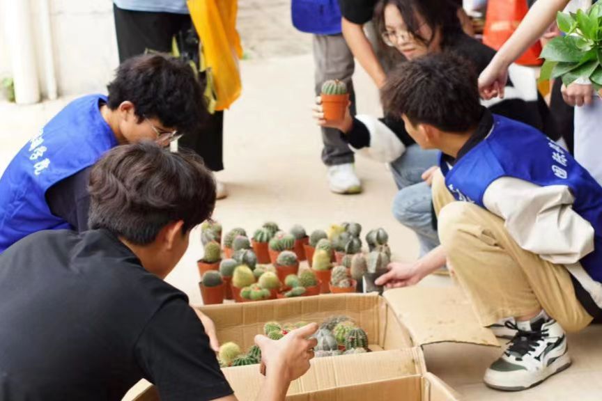活动现场设于二号教学楼一楼空架层,绿植整齐摆放,营造出浓厚的绿色氛围。活动伊始,便吸引了众多员工的积极参与,他们携带着塑料瓶、废弃纸箱和课外书等可回收物品,有序地排队等待兑换。在志愿者的引导下,参与者首先在登记处完成登记,随后由志愿者清点并整理所带物品,确保其数量和质量符合兑换标准。通过这一过程,参与者得以在绿植兑换区域自由挑选心仪的植物。