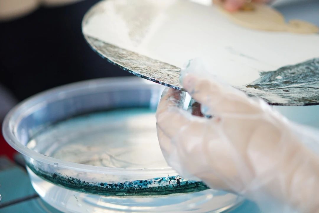 活动开始,手工老师首先介绍了漆扇的文化背景,带大家了解漆扇的制作过程:“漆扇是以箭竹剖丝工艺编成扇骨,以宣纸工艺制成扇面,再用矿物质颜料调和天然大漆沁染制成”。并在现场展示了团扇慢慢放入水中,大漆随着水流附着在团扇上,色彩穿插交错随机而成的过程。