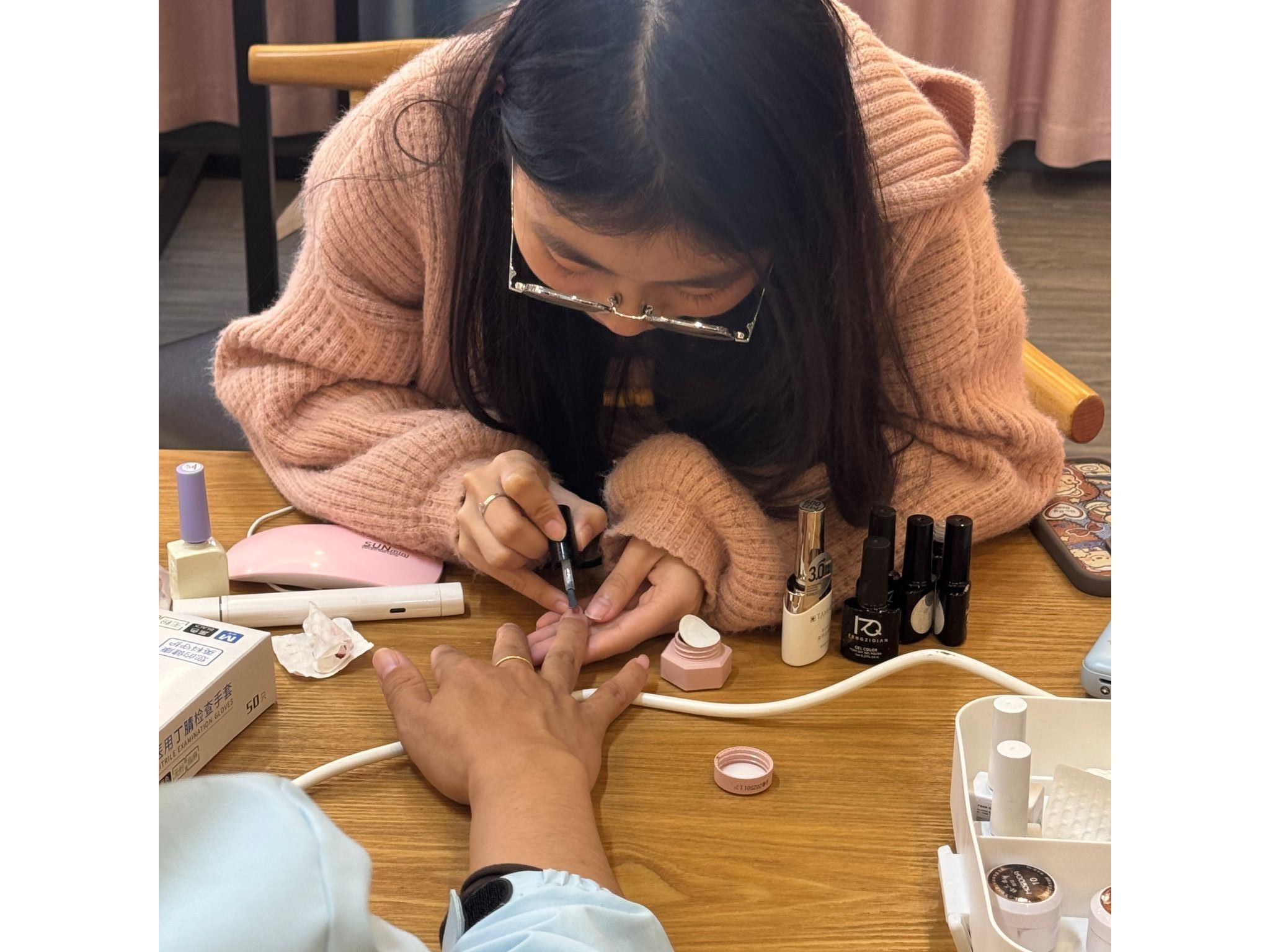 上午,几位员工志愿者们已经就位,为女教师们提供美甲服务,致敬她们的辛勤付出。女教师到场后先修剪甲型,清除死皮倒刺,随后再抛光甲面、涂上底油就开始上色。大家各自挑选了自己喜爱的颜色和样式,耐心地等待上色。在美甲的间隙,教师们不仅学习到了指甲护理的技巧,还交流了工作生活的点滴和自己的兴趣爱好,彼此间的距离也拉近了许多。美甲结束后,志愿者们还给女教师们赠送了养生“开心锤锤”,现场充满了欢声笑语,洋溢着节日的喜悦。