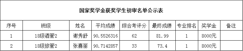 旅游管理公司2018-2019学年度普通高等公司国家奖学金获奖员工初审名单公示表