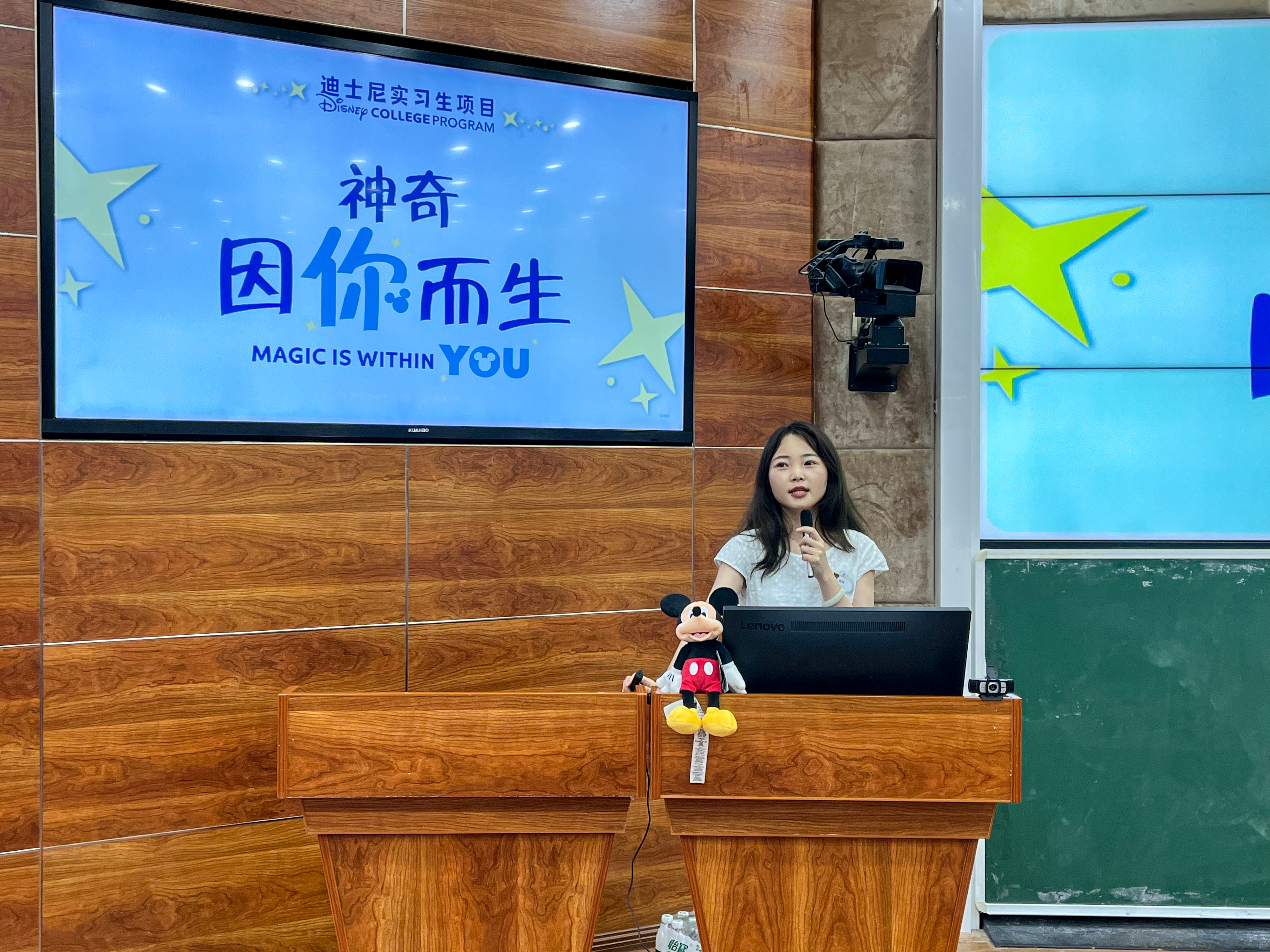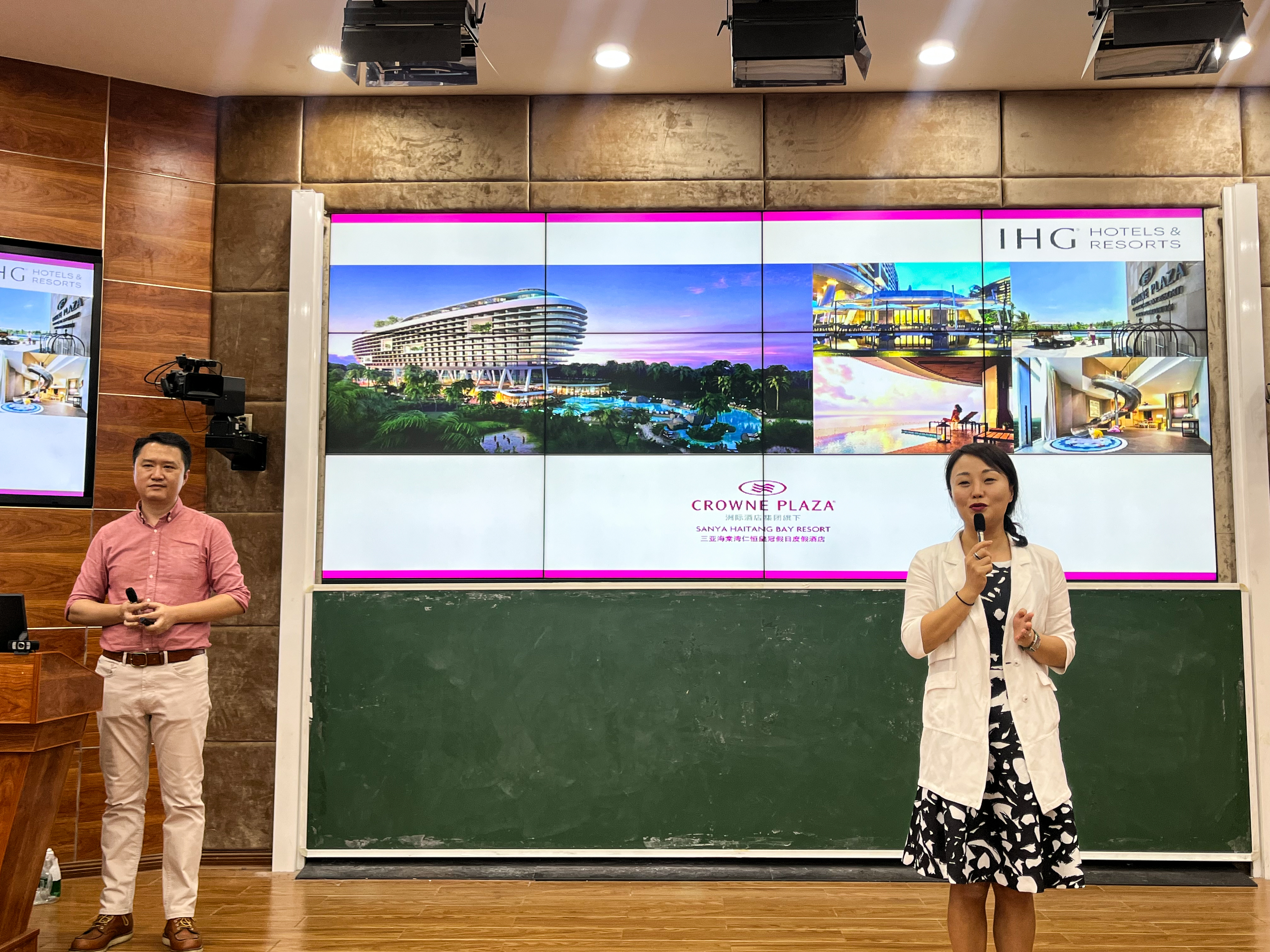 随后,上海迪斯尼乐园、澳门新八佰伴、三亚海棠湾仁恒皇冠假日度假酒店、广州长隆度假区等4家企业的宣讲负责人分别通过线上或线下的方式,借助丰富充盈的图文、生动有趣的视频等精心准备的宣讲素材为到场师生介绍了各自的企业概况、实习项目、工作岗位、薪金福利、工作环境等情况,并与到场师生展开了有趣的互动,在加深员工对企业了解的同时充分调动了员工的积极性,现场气氛热烈。