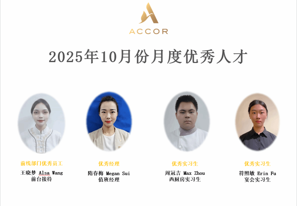 符照敏同学荣获海口费尔蒙酒店2025年10月份月度优秀人才优秀实习生表彰。