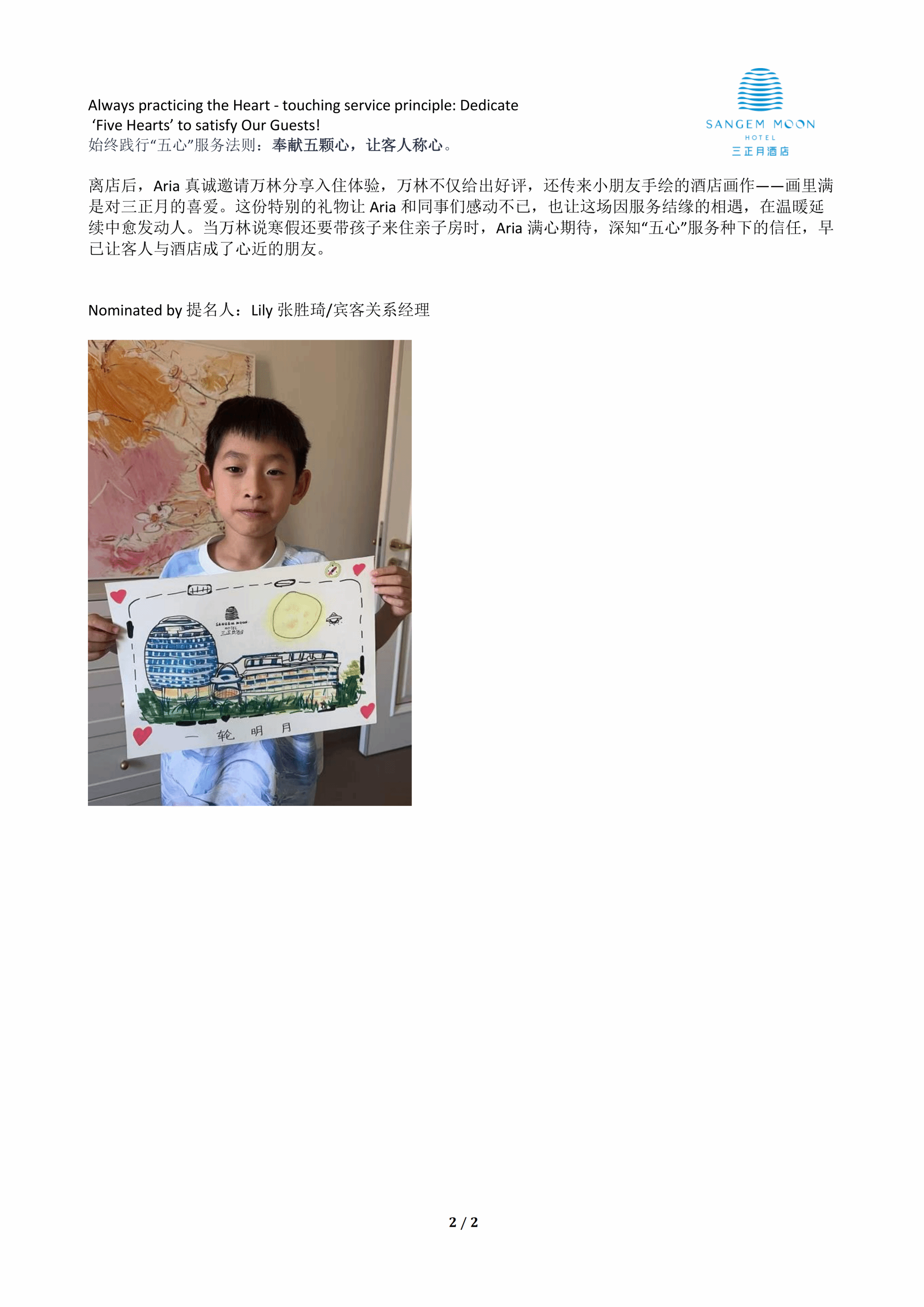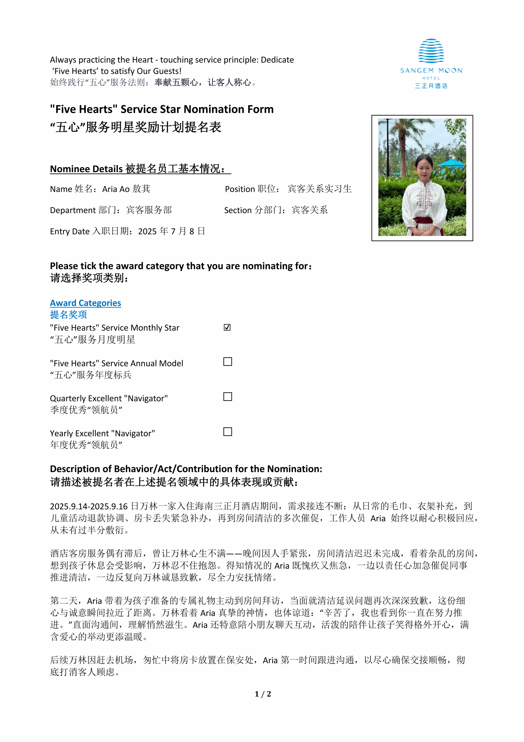 敖萁同学荣获三正月酒店“五心”服务月度明星。