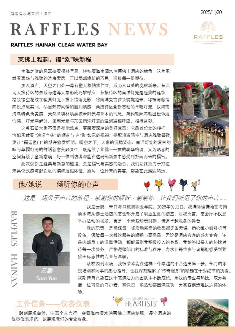 云鹏同学荣获海南清水湾莱佛土酒店专题报道,分享实习心得。