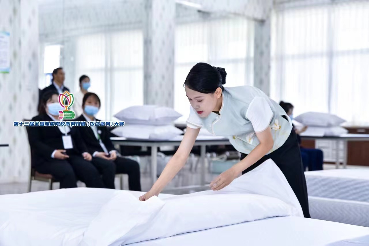 中式铺床赛项一等奖获得者郑英姿同学一丝不苟的完成比赛