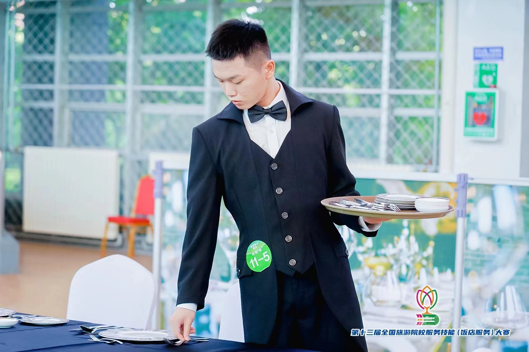 西餐宴会摆台赛项一等奖获得者李政阳同学认真进行每个步骤