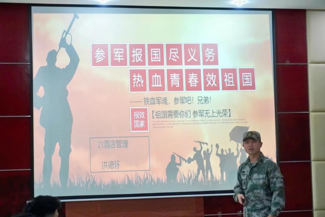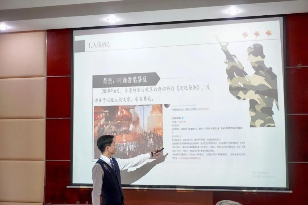 樊靖老师介绍征兵入伍条件及要求,解读当兵的好处以及军营风采展示,号召同学们报名参军入伍,携笔从戎,以自己的实际行动报效国家,把成才梦融入强国梦强军梦,在人民军队这个大舞台上书写人生壮丽篇章。