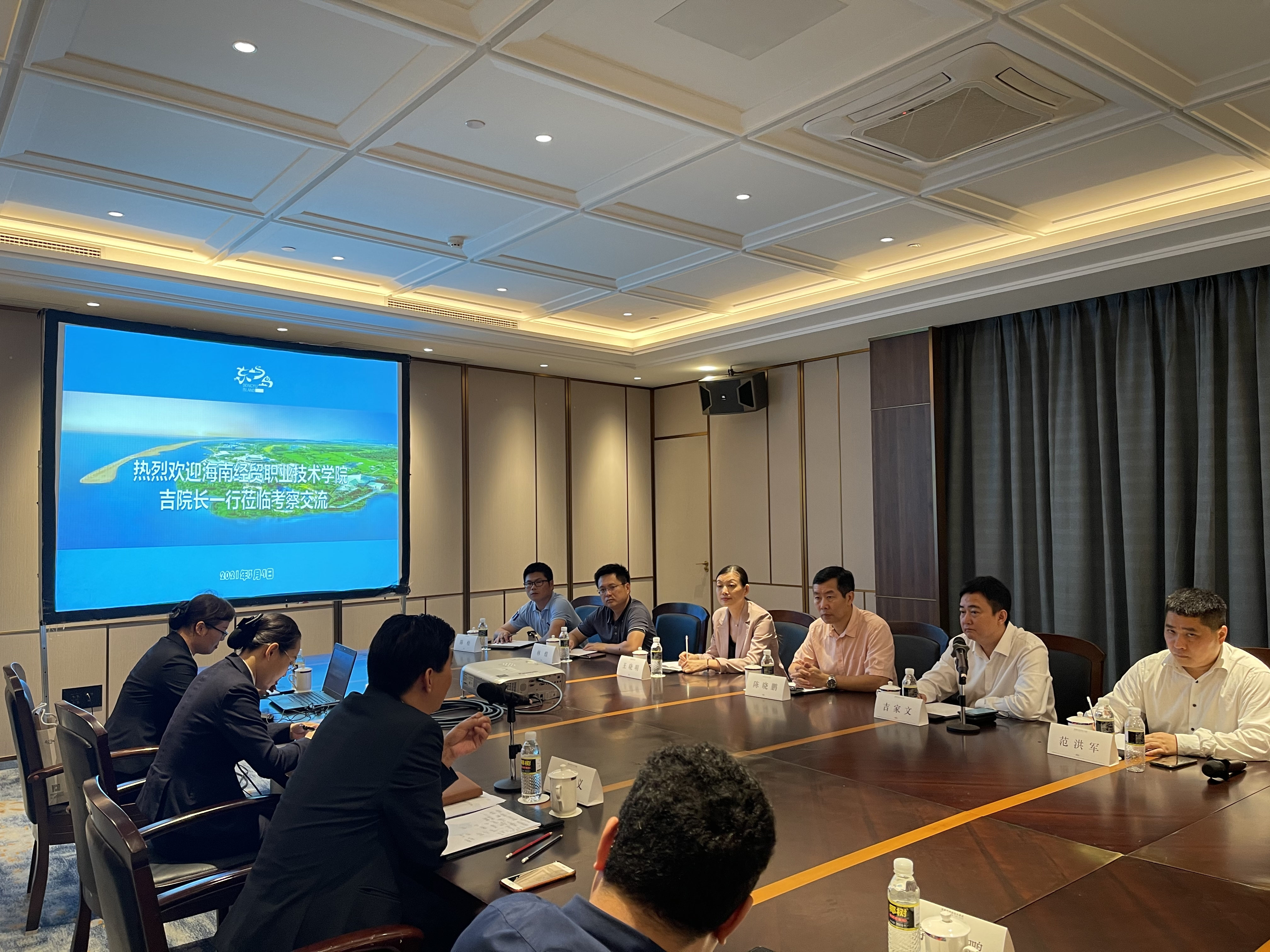 随后,校企双方召开研讨会,双方进行了充分深入的探讨交流。中远海运博鳌有限公司东屿岛旅游度假区党委副书记杨大义、中远海运博鳌有限公司东屿岛旅游度假区市场营销部总监李超鹏、中远海运博鳌有限公司东屿岛旅游度假区景区管理部及高尔夫服务部总监周陆斌出席了此次研讨会。会上,杨大义介绍了度假区的业务组成及近期取得的成果,向大家描述了度假区从管理服务输出向服务品牌输出的转变历程。吉家文介绍了公司“双高”建设和旅游管理高水平专业群建设的目标和进展并提出了双方合作的构想。双方在校企合作人才培养、实习实训教学基地建设、博鳌标准共同制订、优秀团队队伍共建等方面达成广泛共识,并就签订战略合作达成初步意向。