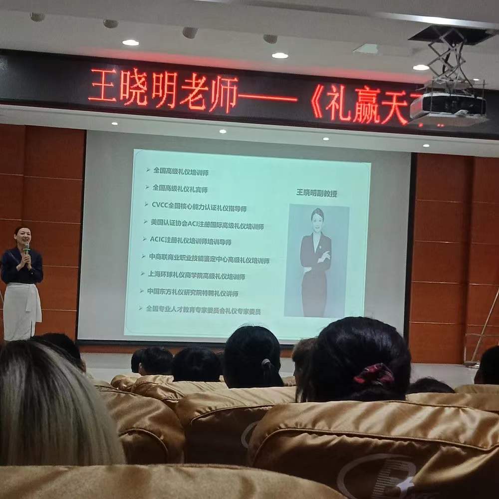 紧接着,是由王晓明老师为我们展开“礼赢天下”主题讲座。此次讲座,王晓明老师指导全体新生如何懂礼、知礼、习礼,增强个人素质,提高个人修养。并通过指导同学们的微笑、神情、肢体动作,使同学们亲身体验到了礼仪的重要性,也让大家明白了细节更是一个人的基本素质和修养。