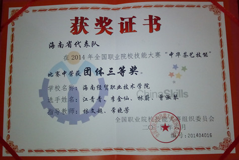 ( 旅游管理系林文超报道)2014年全国职业院校技能大赛高职组中华茶艺赛项6月16日至18日在杭州举行。公司旅游管理系员工曾淑琴、林蔚、江青青、李金仙四名同学代表海南省参赛,表现优秀,获得全国中华茶艺竞赛团体三等奖。