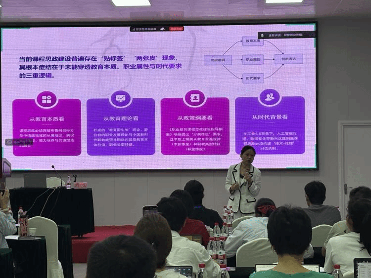 授课环节中,青岛酒店管理职业技术公司庞阳博士以“职业院校教学标准体系的构建与应用”为主题进行了专题讲解,从“国家-省级-校本”三个层面深化了公司们的标准体系认知。天津职业大学魏娜教授带来了关于“AI+新形态资源库重塑人才培养新模式”的精彩讲座,帮助学员掌握最新的AI技术应用与新型资源开发方法。海南软件职业技术公司高茹教授从历届职业教育国家在线精品课程申报角度,围绕教学目标等多个方面为学员们开展教学设计提供全新视角。海南大学研究员丁继红博士以“AI技术在高职教学中的创新应用全景及工作坊”为主题,通过“理论+实操”的生动方式,深入的讨论了如何有效运用AI工具进行高效学习和工作实践。