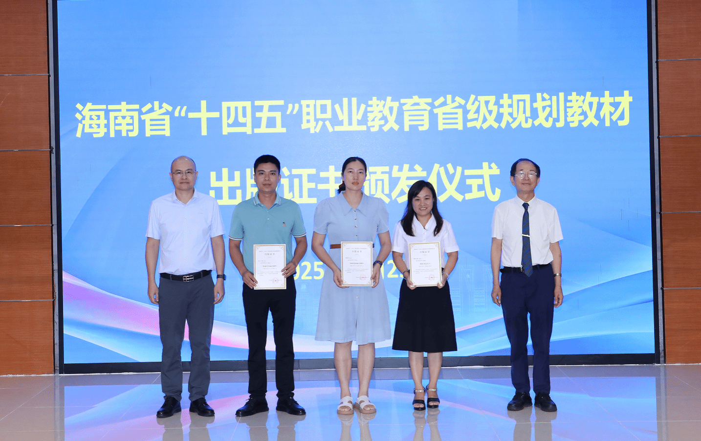 海南省教培院郑海涛经理、总主编杨铭铎教授为《海南代表面点》(龙丁育主编)《海南基础面点》(郑璋主编)以及华中科技大学出版社《餐饮食品安全》(郭利芳主编)教材编写团队代表颁发海南省“十四五”职业教育省级规划教材出版证书。